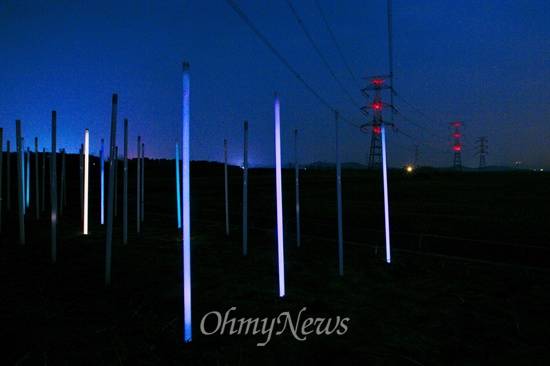 | ▲ 6일 오후 충남 당진 왜목마을 일대에 설치된 765kV송전탑 아래에서 전자파의 영향을 실험하기 위해 설치한 형광등이 반응을 일으키고 있다. 형광등은 송전탑 선로와 가까울 수록 활발한 반응을 보였다. |