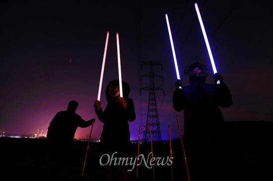 | ▲ 6일 오후 충남 당진 왜목마을 일대에 설치된 765kV송전탑 아래에서 전자파의 영향을 실험하기 위해 설치한 형광등이 반응을 일으키고 있다. |