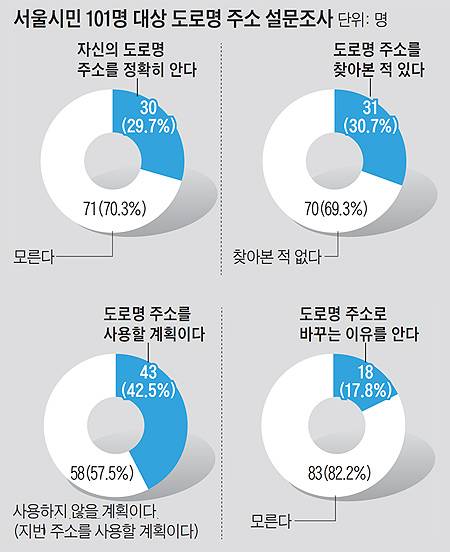 본지가 서울시민 101명을 대상으로 도로명 주소에 대한 설문조사를 한 결과, 자기 집 도로명 주소를 정확히 아는 사람은 30명에 불과한 것으로 나타났다. 지난 1일부터 도로명 주소가 전면 사용되고 있지만, 성인 10명 중 7명이 자가(自家) 공식 주소를 모르는 것이다.