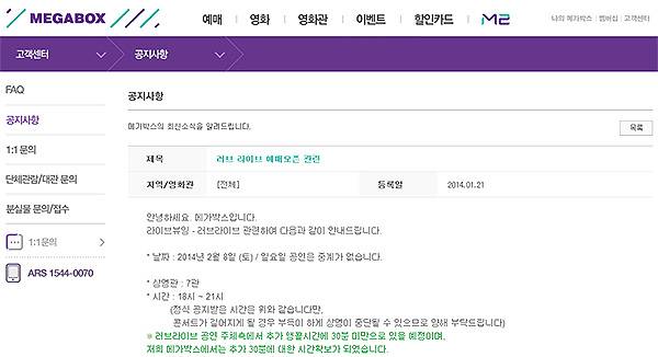 21일 영화관 메가박스 사이트의 첫 페이지에 '러브 라이브 예매오픈 관련'이라는 제목의 공지가 올라왔다.
