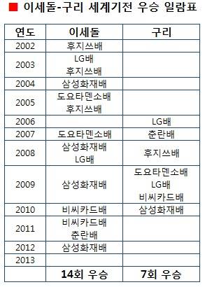조금만 더 시계를 거꾸로 돌려보자. 이세돌은 작년 삼성화재배 결승에서 탕웨이싱에게 0-2로 패해 무관이 된 이후 국내외 기전에서 6연속 준우승이라는 참패를 기록했다. 구리는 2013년 1회 몽백합배 결승에서 17세의 미위팅에게 1-3으로 패배하여 그 역시 국내외기전에서 무관이 되었다.