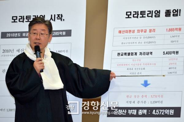 이재명 경기 성남시장은 27일 기자회견에서 "2010년 7월 성남시가 모라토리엄을 선언했을 당시의 '비공식 부채' 7285억원을 작년말 모두 정리했다"며 "3년6개월만에 모라토리엄(채무지불유예) 상황에서 벗어났다"고 밝혔다.