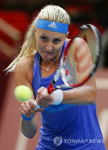 epa04048262 Kristina Mladenovic of France returns the ball to Andrea Petkovic of Germany during their second round match for the GDF Suez Tennis Open tournament in Paris, France, 30 January 2014. EPA/IAN LANGSDON
