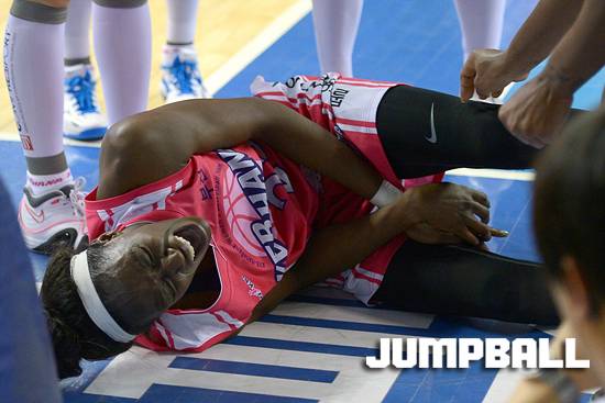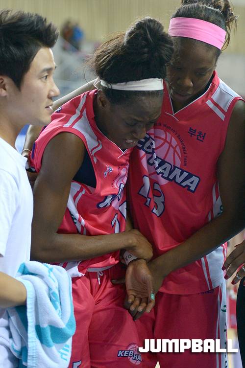 08일 용인 실내체육관에서 열린 2013-2014 우리은행 여자프로농구 용인 삼성생명과 부천 하나외환의 경기에서 하나외환 이파이가 슛을 하고 착지를 하다가 손목 부상을 입고 고통스러워하며 코트 밖으로 나가고있다. 저작권자 ⓒ 점프볼. 무단 전재-재배포 금지2014-02-08 신승규 기자( sks731001@hanmail.net)