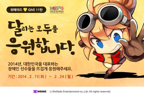 위메이드 엔터테인먼트가 대한장애인체육회와 공동으로 '위메이드 GIVE 11탄, 2014년 달리는 모두를 응원합니다' 캠페인을 시작했다. '위메이드 GIVE'는 위메이드가 서비스 중인 게임과 연계해 전개하는 후원 캠페인이다. 올해 첫 위메이드 GIVE 캠페인은 소치 동계패럴림픽을 기념해 '윈드러너' '비행소녀' '격추왕' '에어헌터' 4가지 모바일게임에서 오는 24일까지 진행된다. 위메이드는 이용자가 각 게임에 접속해 친구들에게 메시지를 보내면 10원씩 적립해 이를 대한장애인체육회에 전달할 계획이다.