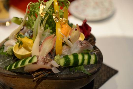 우선 맛깔스럽고 풍성한 가이세키요리는 샴페인 등 식전주로 시작한다. 전체 요리로 아소지역의 말고기회(바사시), 코티지치즈, 게살과 국화잎의 키누타마키(생선 등을 얇은 식재료로 말아낸 요리)가 나온다. 푸아그라와 곶감, 쑥갓 된장과 핫보우소스를 곁들인 연두부, 소송채와 구운 표고버섯 무침, 오리훈제와 사과 꼬치, 아몬드를 묻혀 튀긴 연어전병, 토란줄기의 가다랑어포 무침, 돈부리와 날치 알을 곁들인 가지스프 등 맛나고 진귀한 요리들이 줄을 잇는다. 이후 국요리가 나온다. 무로 만든 떡튀김과 꽃게조각, 완두를 올린 호박스프 등이 그것인데 쫄깃한 떡튀김의 식감이 일품이다. 고등어, 골뱅이, 생새우 등의 카이아소 생선회, 그리고 다진 새우 신비키 튀김, 제철야채튀김 등의 튀김류, 부드러운 달걀에 다양한 재료를 넣어 찐 오보로찜, 두부껍질 백합뿌리찜 등의 찜류, 일품요리로 와규- 능성어 샤브샤브, 흰쌀밥에 개운한 미소된장국 식사 등 10가지의 진귀한 별미가 줄을 잇는다. 이후 밤아이스크림과 무스 사과풍미 등 5가지(택일)의 후식이 순서를 기다린다.