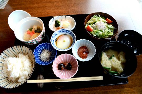 예약한 시간에 먹게 되는 아침 식사도 정갈하지만 풍성하다. 부드러운 비단두부찜, 모로미다시마, 가마아게 멸치, 오징어젓갈, 온천계란, 조림요리, 야채샐러드, 오늘의 건어물(마른 생선구이), 쌀밥에 보리된장국, 야채절임, 과일, 그리고 황금색 젓소우유(5가지의 음료 중 하나를 고른다) 등 한상 가득이다.