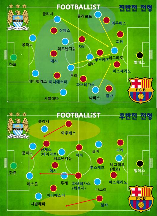 그러나 페르난지뉴와 투레가 시간이 갈 수록 체력적 어려움을 겪으며 공수 간격이 벌어졌고, 측면과 중앙을 동시에 커버할 수 없게 된 수비가 급격히 흔들렸다. 콜라로프와 나바스가 빠지면서 알바와 아우베스가 자유롭게 오버래핑을 시도했다. 특히 데미첼리스가 퇴장 당하기 전까지 측면 수비에 주력하느라 공격 가담을 거의 하지 못했던 아우베스가 완전히 살아났다. FC바르셀로나의 공격 패턴이 더 다양해졌다. 아우베스가 윙 플레이를 시작하면서 맨시티 수비는 흔들리기 시작했고, 후반전에 바르사는 8차례 슈팅을 시도하며 경기를 장악할 수 있었다.
