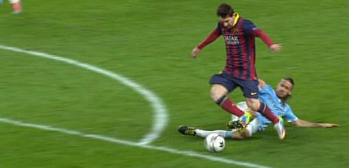 실제로 느린 그림으로 확인한 결과 페널티 에어리어 바깥에서 파울이 이루어졌다. 그러나 공이 앞으로 빠져나간 상황에 뒤에서 가한 태클이기에 퇴장 판정에는 무리가 없었다. 이 판정은 FC바르셀로나에게 행운이었고, 맨시티에겐 저주가 됐다. 맨시티의 작전은 데미첼리스의 퇴장으로 물거품이 됐다.