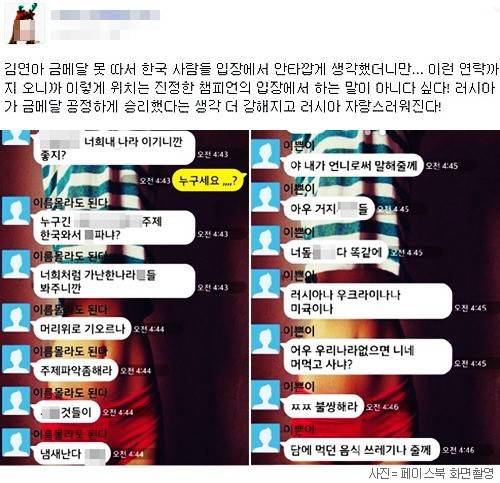 러시아의 심판진 개입 의혹이 불거지고 소트니코바의 당돌한 발언이 쏟아지면서 우리나라의 일부 네티즌 사이에서는 '안티 러시아'가 고조됐고, A씨는 첫 번째 희생양이 되고 말았습니다. A씨는 SNS와 모바일메신저로 쏟아져 들어온 메시지 내용을 페이스북에 잠시 공개했다가 지금은 모두 삭제했습니다. 하지만 A씨의 피해 상황을 실시간으로 목격한 다른 네티즌들이 SNS로 알리면서 파장이 계속되고 있습니다.