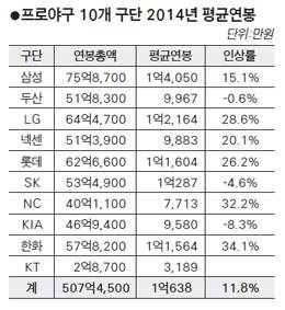 구단별로는 프로야구 사상 첫 통합 3연패를 달성한 삼성이 연봉 총액 75억8,700만원, 평균 1억4,050만원으로 최고 연봉 구단 자리를 지켰다. 신인 선수는 제외함에 따라 대부분 루키들로 채워진 10구단 KT의 연봉 총액은 2억8,700만원에 불과했다. 자유계약선수(FA) 정근우와 이용규를 영입한 한화는 평균 1억1,564만원으로 지난해의 8,623만원보다 평균 연봉이 무려 34.1%나 상승했다.