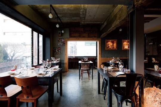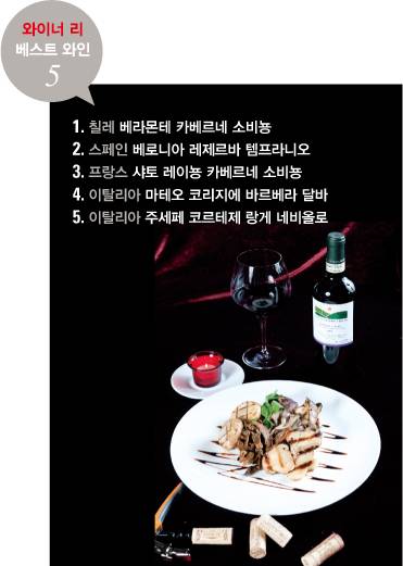 와인 & 요리_ 와이너 리에는 와인 리스트가 따로 없다. 진열대의 300여 종 와인이 모두 리스트다. 입구에 들어서면 마치 와인숍에 온 것 같은 착각을 불러일으키는데, 와인을 구경한 뒤 취향과 가격대를 고려해 골라 마시면 된다. 한 달에 40종류 정도 바뀌니, 1년이면 800~900가지 와인이 소개되는 셈이다. 칠레 베라몬테, 스페인 베로니아, 프랑스 샤토 레이뇽, 이탈리아 마테오 코리지에, 주세페 코르테제는 베스트 와인으로 꼽힌다. 경북 봉화에서 직접 공수해 온 국내산 자연산 송이와 이탈리아 포르치니버섯(표고·양송이·새송이)을 함께 담아낸 모둠버섯구이, 생양송이와 핫베이컨드레싱의 시금치샐러드, 국내산 오겹살 오븐구이와 백김치(참깨드레싱), 국내산 한우로 만든 안심스테이크, 양송이 베이컨 크림소스 떡볶이 등이 대표 메뉴다. 그림 그리는 솜씨만큼이나 손맛이 좋아 한번 그의 음식을 먹어본 손님들은 와이너 리의 팬이 된다. 이 사장은 요즘도 전 세계 와이너리를 돌며 각종 와인과 요리를 접한 뒤 손님에게 최상의 마리아주를 선사하는 데 주력하고 있다.