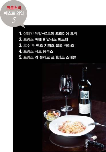 와인 & 요리_ 크로스비는 매달 '이달의 와인' 11가지를 선정한다. 매달 계절에 맞는 와인을 선별하는데, 스파클링 와인 세 가지, 화이트 와인 세 가지, 레드 와인 세 가지, 스위트 와인 두 가지 등이다. 크로스비의 가장 큰 장점은 이처럼 매달 새로운 와인을 글라스로 맛볼 수 있다는 점이다. 병으로 서비스되든, 글라스로 판매되든 매달 잘나가는 와인은 이달의 와인이라 할 수 있다. 굳이 분류하자면 크로스비는 신세계 와인보다는 프랑스와 이탈리아 등 유럽 와인의 비중이 높다. 이는 다른 와인바에 비해 크로스비가 보다 잘 아는 분야이기도 하다. 음식은 20여 가지가 준비돼 있다. 하지만 음식보다는 다양한 종류의 치즈가 인기가 높다. 크로스비에서는 20가지 이상의 좋은 치즈를 갖고 있는데, 와인에 적합한 치즈를 선보이려고 노력하는 편이다.