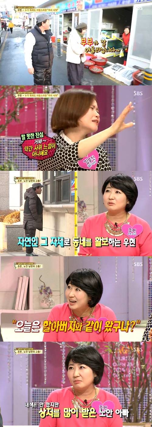 화면을 통해 이 장면을 접한 우현의 아내는 "사실 아이가 6살 때 남편과 함께 유치원에 간 적이 있다. 평소 남편이 꾸미지도 않지만 그때 유치원 선생님이 아이에게 '오늘은 할아버지-엄마랑 왔구나'라고 말했다. 그 상처에 남편이 다음 날 아이의 유치원을 바로 바꿔버렸다"고 말해 웃음을 자아냈다. (사진=SBS '백년손님 자기야' 캡처)