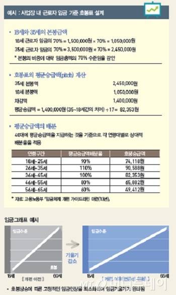 여기서 40대에 평균승급액(100%)을 지급하는 것을 기준으로 각 연령대에서 상대적인 배분율을 적용한다. 25세까진 평균승급액의 90%, 35세까지 110%, 45세까지 100%, 이후에는 80%, 60%를 지급하는 방식이다. 이렇게 하면 호봉 상승에 따른 고정 임금 인상을 최소화해 임금 기울기가 완만해진다. 입사 초 근로자와 중장년 근로자의 호봉승급을 낮출 수 있다.