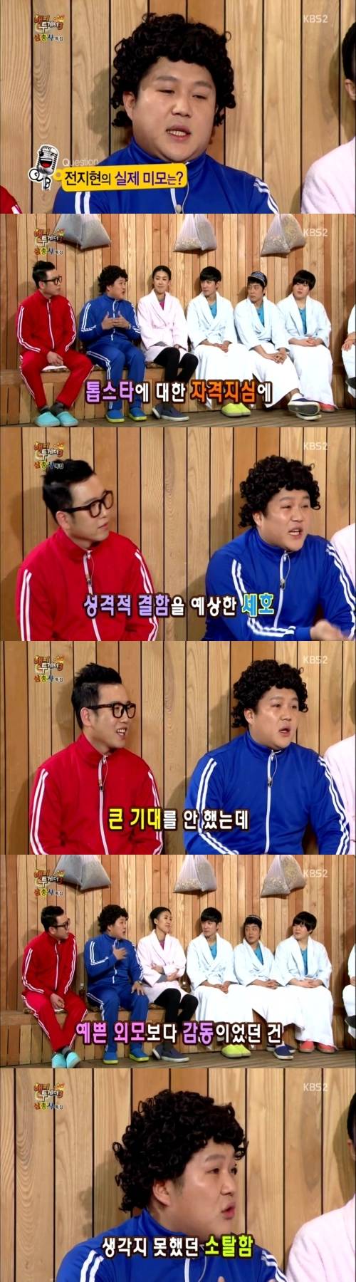 이에 박명수는 조세호에 전지현의 미모에 대한 질문을 던졌다. 이에 조세호는 "톱스타에 대한 자격지심 때문에 성격적 결함이 있을 것이고, 결혼을 해서 예쁘지 않을 것이라고 예상했다"며 전지현을 만나기 전 갖고 있던 선입견을 밝혔다. 그러나 조세호는 "그렇게 큰 기대를 안했는데, 너무 예뻤다"며 전지현의 실물 미모에 찬사를 보냈다.