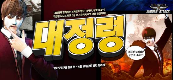 넥슨은 대정령 캐릭터 출시를 기념해 4월 10일까지 대정령 퍼즐 조각 아이템을 모아 퍼즐을 완성한 선착순 500명의 유저에게 대정령 팬미팅 초대권과 '서든어택 기프트 세트(마우스패드, USB메모리)'를 선물하며, 퍼즐을 완성한 모든 유저 중 추첨을 통해 100명에게 '대정령 캐릭터 세트(100일)' 아이템을 지급한다. 또한, 이벤트 기간 동안 '대정령 캐릭터 기간 33일'을 모으면 '대정령', '참 쉽죠?', 'BJ' 등의 특별 칭호 3종을 100% 제공한다.