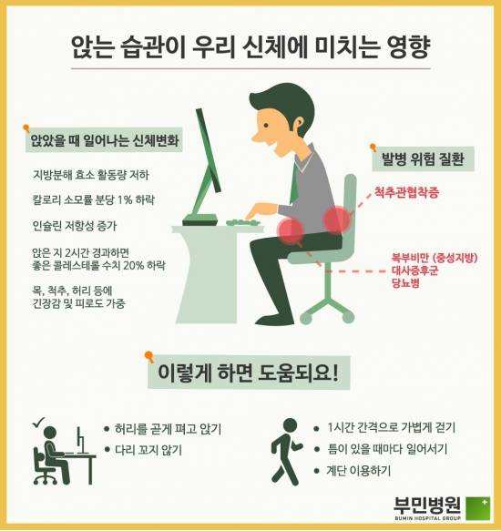 건강을 위해 운동을 하고 좋은 식습관도 기른다. 하지만 하루 4시간 이상 앉아서 생활한다면 이 모든 것이 무용지물이 될 수 있다. 평소 대수롭지 않게 생각하는 앉는 습관이 어떻게 건강을 해치는 것일까. 장시간 계속해서 앉아 있으면 신체의 신진대사가 원활하게 돌아가지 않는다. 혈액순환을 방해하고 지방을 분해하는 효소의 활동성을 저하한다. 혈당을 낮추는 인슐린의 기능이 떨어지는 인슐린 저항성 또한 높아진다. 이는 대사증후군을 비롯하여 심혈관계 질환을 초래할 수 있다. 앉는 자세를 오랜 시간 취하면 척추 및 관절이 경직되고 피로도가 가중되어 근골격계 질환발병 위험도 높아진다.