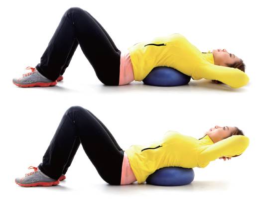 <mediamedia-type="image"><media-referencealign="center" data-location="#eyoree20140403160743_F_21_C_1" mime-type="image/jpeg"> 크런치 동작1) 등 쪽에 볼을 놓고 바른 자세로 눕는다. 이 때 양무릎은 90°로 접어 세운다. 2) 내쉬는 숨에 몸통을 일직선이 되는 선상까지 끌어 올려 3초간 유지하다가 천천히 숨을 들이마시며 제자리로 돌아간다. 동작은 1회 시 2초간 유지하고 10회, 3세트 반복하면 된다.
