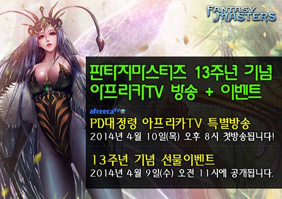 제오닉스는 온라인 TCG '판타지마스터즈'의 서비스가 13주년을 맞아 아프리카TV와의 제휴를 통해 오는 10일부터 4주간 인터넷 방송 이벤트를 진행한다.