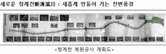 청계천 복원사업 진행 중 서울시 치수과에서 제작한 '청계천 복원공사 계획도'속의 청계천 모습과 현재 복원된 후 모습을 비교해 볼 수 있도록 했다.