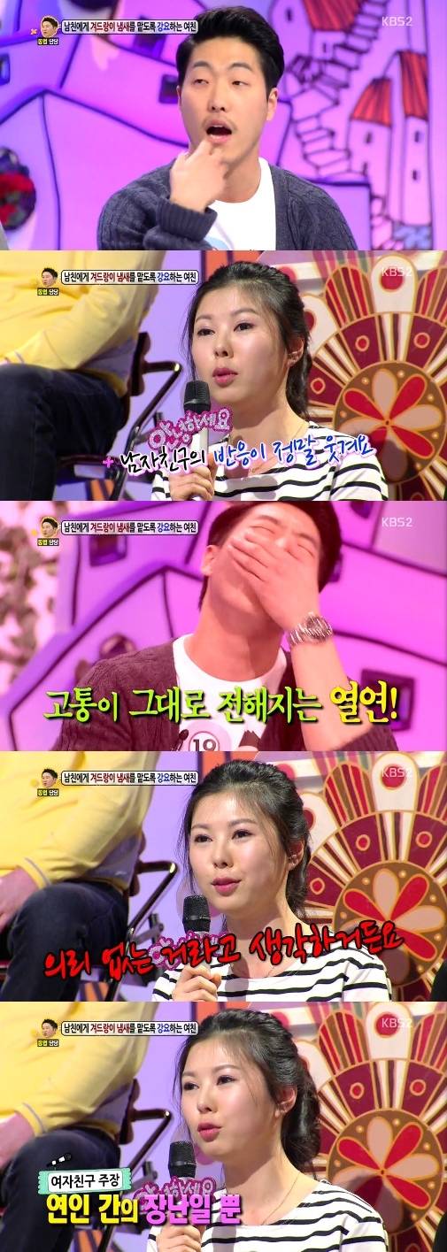 [OSEN=오민희 기자]'안녕하세요' 연인에게 겨드랑이 냄새를 맡도록 강요하는 여자친구가 등장해 좌중을 경악케 했다.