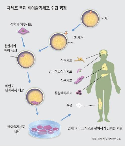 국내 연구진이 사람의 피부세포를 복제해 배아줄기세포를 만드는데 성공했다. 불임치료 후 남은 수정란 대신 체세포를 복제해 인간 배아줄기세포를 만든 것은 미국에 이어 세계 두 번째다. 황우석 전 서울대 교수가 2004년 미국 과학학술지 사이언스에 논문을 발표했다가 데이터 조작 사실이 드러난 바로 그 세포를 한국 연구진이 만든 것이다.
