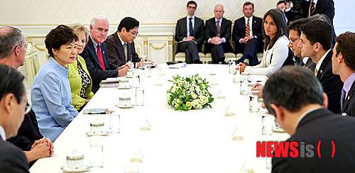 【서울=뉴시스】박근혜 대통령이 23일 오후 청와대에서 美하원 대표단을 접견하고 있다.