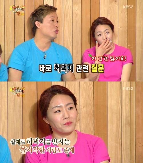 이상화는 5월 15일 방송된 KBS 2TV '해피투게더3'에서 "허벅지 관련 질문은 어떠냐"는 MC들의 물음에 "그건 싫다"고 답했다.