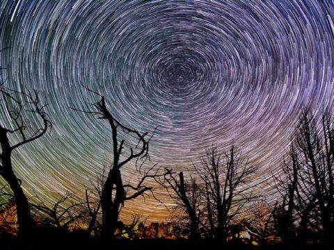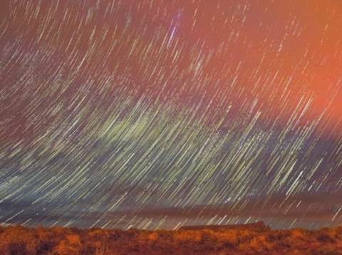 황혼녘에 찍은 이 소용돌이치는 컬러사진에서 별들은 지평선에서부터 부서지기 시작하는 것처럼 보인다.