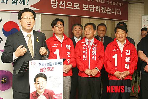 【강릉=뉴시스】김경목 기자 = 제6회 전국동시지방선거 공식선거운동을 하루 앞둔 지난 21일 권선동 국회의원이 강원도의원 강릉시 제3선거구(포남1·포남2·성덕동)에 출마한 새누리당 김용래(53) 후보의 선거사무소 개소식에서 김용래 후보 지지를 호소하고 있다. 2014.05.22.