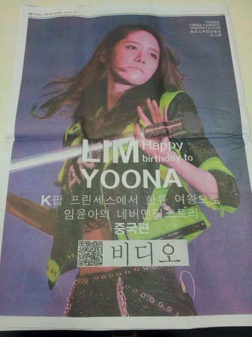 이후 생일 당일에는 중국 윤아 팬클럽이 한 일간 신문 전면에 "Lim YoonA Happy Birthday to You"라는 축하 광고를 게재, 중국에서 윤아의 인기와 영향력을 실감할 수 있었다.