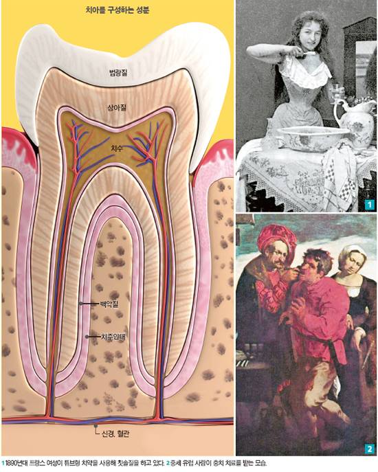 보통 치아는 유치(생후 6~8개월 생겨 3살까지 자라는 치아) 기간을 거쳐 6살부터 생기는 영구치(유치가 빠진 후 다시 자라는 치아)로 자라게 된다. 영구치는 사랑니를 제외하면 보통 28개인데 윗니 14개, 아랫니 14개로 구성된다. 우리가 치아를 닦을 때 마다 거울을 통해 보는 치아 표면은 하얗고 단단하게 보인다. 하지만 속은 굉장히 복잡하다. 치아 표면을 이루고 있는 '법랑질'은 우리 몸에서 가장 튼튼한 조직으로 무기질(생명체를 이루는 칼슘·인 등의 물질) 성분이 전체의 96%를 차지하고 있다. 음식을 씹거나 깨물 때 턱에 가해지는 60~70㎏의 힘을 버터야 하기 때문이다.