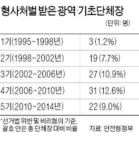 11일 안전행정부에 따르면 1995년 지방자치가 부활한 이후 20년간 형사처벌로 물러난 광역·기초자치단체장은 102명으로, 이 기간 선출된 자치단체장(1230명)의 8.3%에 이른다. 민선 1기 단체장 3명, 2기 19명, 3기 27명, 4기 31명, 5기 22명 등이 비리로 낙마했다.
