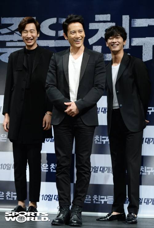 배우 지성(가운데)이 12일 압구정 CGV에서 열린 영화 좋은 친구들 제작발표회에서 키를 커보이기 위해 한발 앞서서 포즈를 취하고 있다.(왼쪽은 이광수, 오른쪽은 주지훈) 영화 '좋은 친구들'은 우발적인 사건으로 의리와 의심 사이에서 갈등하는 세 남자를 그린 범죄 드라마. '좋은 친구들'을 통해 첫 호흡을 맞춘 지성, 주지훈, 이광수의 감각적인 비주얼과 강렬한 드라마를 담고 있다. 사진=김재원 기자 jkim@sportsworldi.com2014.06.12