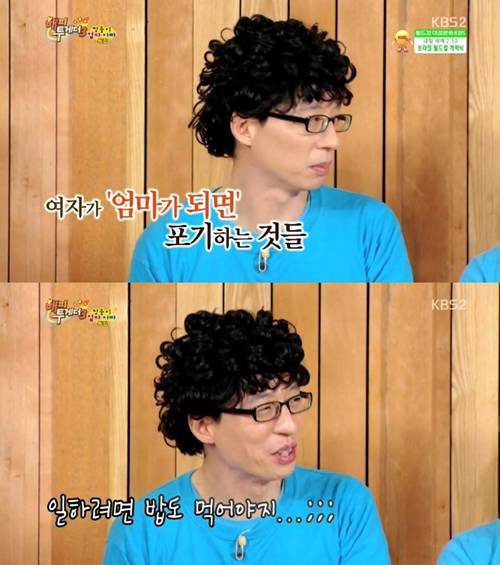 이날 MC유재석은 "(아내에게) 서운할 때가 많다. 아이 밥을 만들 때는 갈고 끓이고 시간이 오래 걸리는데 난 밥 하나 딱 주더라"고 말했다.