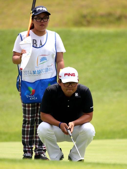 김인호가 13일 전남 보성에서 열린 2014 보성CC클래식 2라운드에서 여동생 김유나와 함께 퍼팅 라인을 읽고 있다. [사진=KPGA]