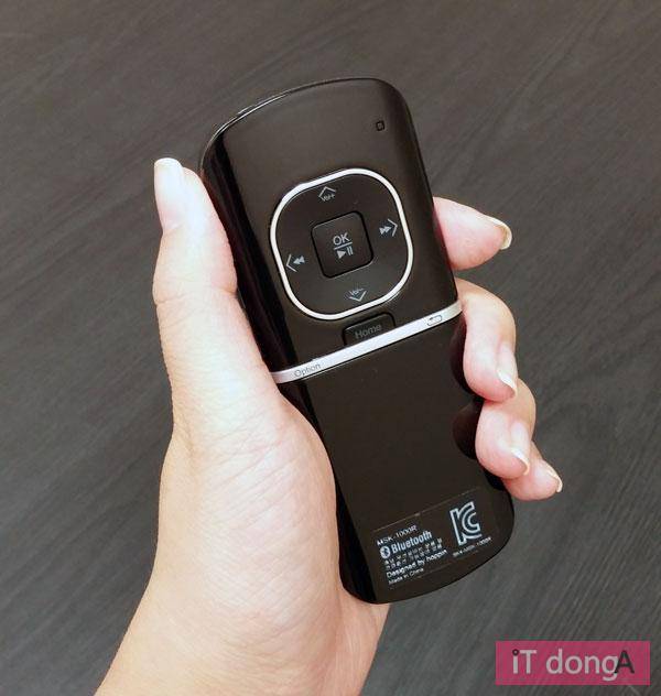모본 컨트롤러는 이름 그대로 리모컨 모양이다. 길쭉한 바 형태로, 앞면에는 음악을 재생하거나 음량을 조절하는 버튼이 자리했다. 뒷면에는 블랙베리 키보드를 꼭 닮은 쿼티형 키보드가 배치됐다. 키보드가 있는 것을 보아하니, 스마트 기기와 무선으로 연결해 사용할 수 있겠다. 키보드 위쪽에 스피커가, 아래쪽에 마이크가, 그리고 키보드에 통화 키가 있는 것을 보니 전화통화도 가능한 제품임을 알 수 있다.