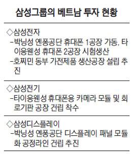 삼성디스플레이가 이번 투자를 결정함에 따라 베트남에는 삼성전자를 비롯한 전자 계열사들이 모두 진출하게 됐다. 삼성전자는 박닝성 옌퐁공단에 연산 1억2,000만대 규모의 세계 최대 휴대폰공장을 가동 중이며, 인근 타이응웬성에도 같은 규모의 제2공장을 완공해 시험생산 중이다. 또 삼성전자는 최근 호찌민 동부에 10억 달러를 투자해 대규모 가전공장 설립도 추진하고 있다. 이 밖에 삼성전기 역시 타이응웬성 옌빈공단에 12억3,000만 달러를 들여 휴대폰용 카메라 모듈 및 회로기판 공장 건립에 착수한 상태다.