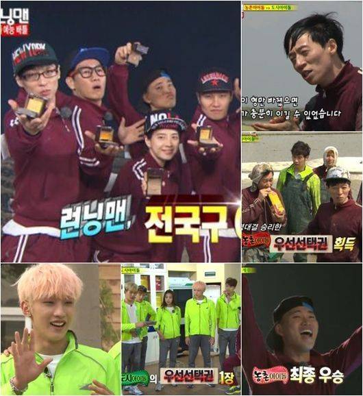 '런닝맨' 멤버들은 22일 오후 방송된 SBS 예능프로그램 '일요일이 좋다-런닝맨'에서 막강한 도시아이돌을 누르고 예능 배틀 게임에서 최종 우승을 거뒀다.