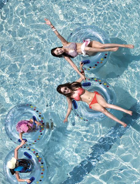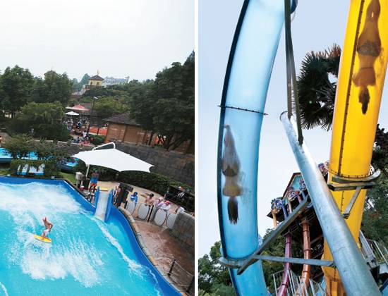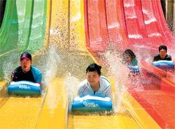 튜브 없이 맨몸으로 건물 4층 높이에서 낙하하는 '스피드 슬라이드', 4인용 튜브 보트에 둘러 앉아 200m 슬라이드 코스를 구불구불 내려오는 '훼미리 슬라이드'는 한여름 더위를 떨쳐 버리기 충분하다.