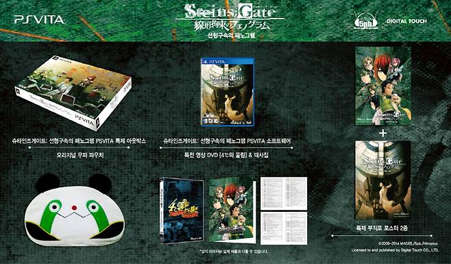 - 게임 소프트 웨어- 특제 아우터 박스 (PlayStation® 3. PlayStation® vita)- 오리지널 우파 파우치- 슈타인즈 게이트 성우 DVD- 슈타인즈 게이트 성우 DVD 대사집- 슈타인즈 게이트: 선형구속의 페노그램 특제 포스터 2종- 가격: 64,800원(PlayStation® 3) / 69,800원(PlayStation® vita)