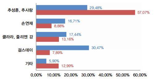 이에 따르면 407명의 남성 응답자 중에서 추성훈, 추사랑 부녀를 가장 선호하는 사람은 120명(29.48%), 손연재를 가장 선호하는 사람은 68명(16.71%), 클라라와 줄리엔 강을 가장 선호하는 사람은 71명(17.41%), 걸스데이를 가장 선호하는 사람은 124명(30.47%), 기타 광고모델을 가장 선호하는 사람은 24명(5.90%)으로 나타났다.