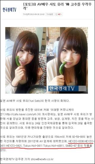 AV 배우라고 딱히 야한 사진이 있는 것은 아니다. 풋고추를 베어 먹는 설정사진이 특이하긴 하지만. 누리꾼의 찬사를 불러일으킨 것은 기사 본문 중 언급된 그녀의 작품 리스트다. "사토 유리는 1991년생 가나가와현 출생으로 154㎝의 키에 92-59-88의 늘씬한 각선미를 자랑하며 2011년에 AV 업계에 데뷔했으며, HEYZO-0336 HEYZO-0411 HEYZO-0421, Tokyo Hot-0411 Tokyo Hot-n0811, SMBD-67 등의 작품을 냈다."