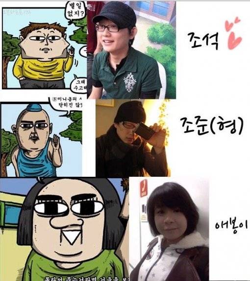 공개된 사진에는 작가 조석을 비롯해 형 조준과 애봉이의 캐릭터와 실제 모습이 비교되어 있습니다. 특히 '애봉이'는 웹툰 속 캐릭터 애봉이의 모습과 100% 싱크로율을 선보여 많은 네티즌들의 시선을 끌었습니다.