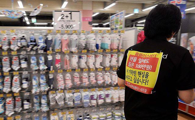 15일 서울 영등포 홈플러스 매장의 노동조합원. 배우한기자 bwh3140@hk.co.kr