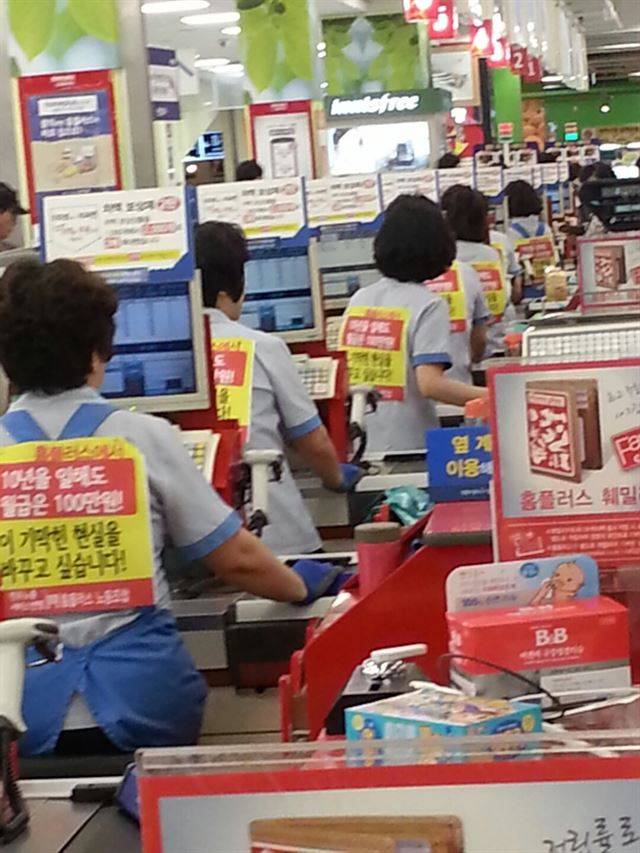 13일 쟁의지침에 따라 등벽보를 부착하고 근무하고 있는 홈플러스 점포 근로자들. 홈플러스 노조 제공