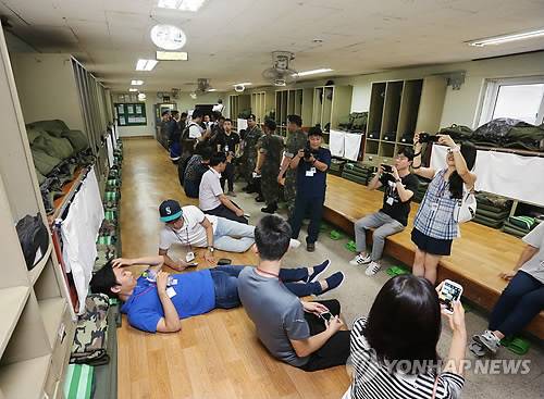 (연천=연합뉴스) 임병식 기자 = 21일 오후 경기도 연천군 육군 5사단에서 열린 국방예산 현장체험에서 체험단이 구형 생활관을 둘러보고 있다. 2014.7.21