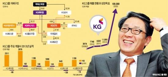 KG그룹은 2020년 매출 목표를 10조원으로 잡고 있다. 앞으로 7년 안에 덩치를 또 10배 불리겠다는 공격적 성장 전략이다. 목표를 달성하기 위해선 연간 40%씩 매출이 늘어나야 한다. 지난해 상장법인 1541개, 비상장 주요 기업 169개의 평균 매출 증가율이 0.7%임을 감안하면, '자연 성장'만으론 사실상 실현 불가능한 목표다. 공격적인 추가 M & A를 예고하는 대목이다.