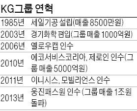 그후 10년간 거의 해를 거르지 않고 M & A에 나섰다. 2005년 시화에너지(발전·현 KG ETS)를 시작으로 옐로우캡, 제로인, 이니시스, 웅진패스원 등을 계속 사들였다.